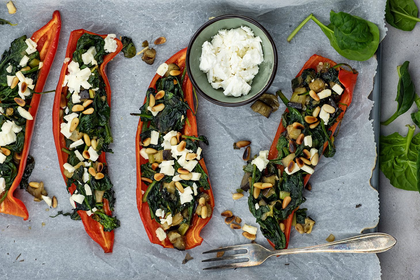 Je mengsel is klaar als de blaadjes van de spinazie zijn geslonken en er eigenlijk niet meer uitzien als blaadjes. Verdeel nu het mengsel over je puntpaprika’s.